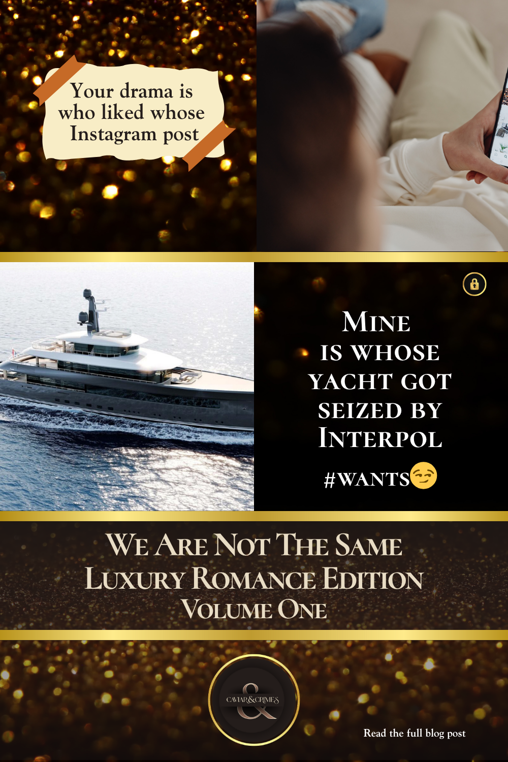 We are not the same. Your first date needed reservations, mine needed passports. Your suspense is "will he text back," mine is "will the hitman find us first." Welcome to #wants😏—the Luxury Romance edition.